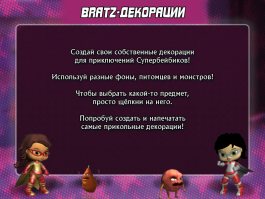 Bratz: Super Babyz — это казуальная игра для всей семьи события которого разворачиваются во вселенной Братц. Инопланетные создания высадились на Земле и теперь угрожают мирным жителям полным уничтожением! Какое счастье, что неугомонные девчонки смогли проникнуть на корабль злобных пришельцев и выкрасть уникальную разработку под названием зультразуппер. Именно он позволил девочкам превратиться в супергероинь и теперь монстрам точно не поздоровится!