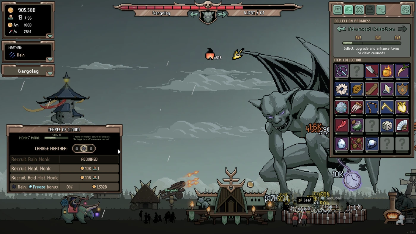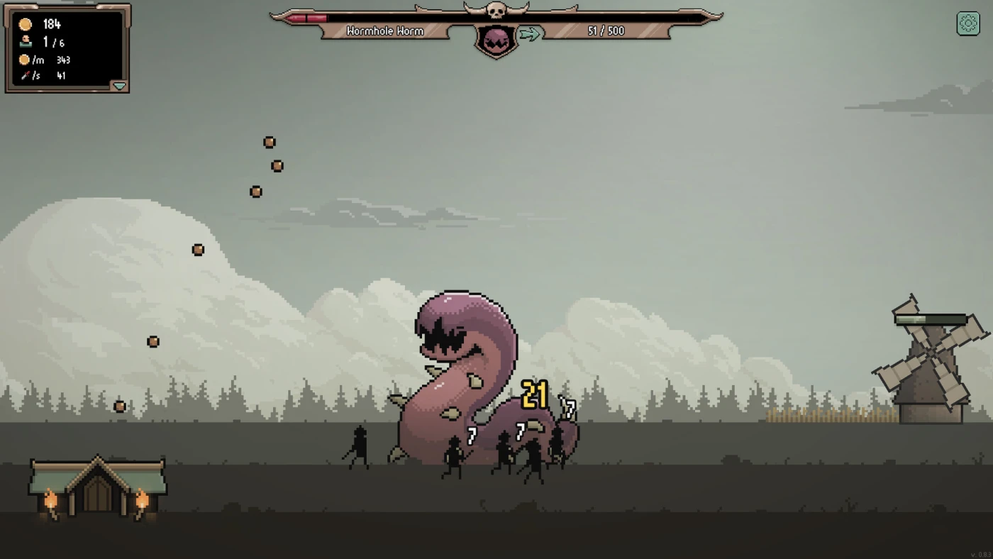 Постепенно ваш лагерь превращается в полноценное королевство. Вы строите здания, управляете населением, выбираете советников – каждого можно экипировать уникальными предметами, усиливающими армию, экономику или магию. Баллиста, метеоры, мощные заклинания – всё это можно разблокировать и комбинировать. Чем дальше, тем сложнее становятся синергии: правильно подобранные улучшения дают безумные комбо, которые буквально разносят боссов на части. При этом вы сами решаете – играть активно или просто наблюдать, как прогресс идёт сам по себе.
