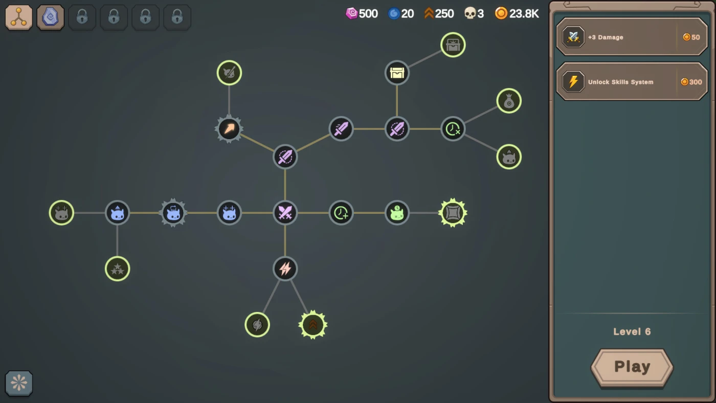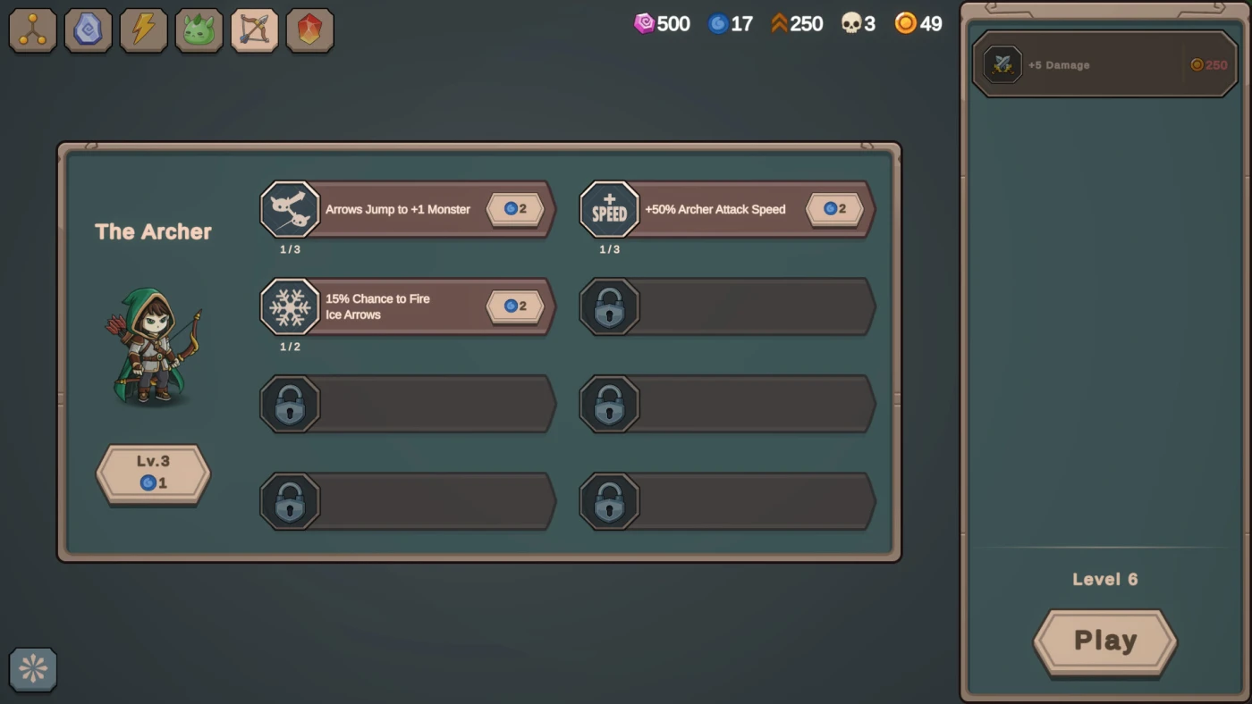 Вас ждёт огромное древо навыков, где каждый узел – не просто цифра, а реальное изменение игрового процесса: рикошетящие стрелы, шанс на дополнительный урон, усиление при сборе руды или даже появление сияющих монстров с уникальными эффектами. Добычу можно не только собирать, но и улучшать – обрабатывайте драгоценные камни, настраивайте экипировку под свой стиль и экспериментируйте с комбинациями. А ещё убийство слизней даёт ресурсы для крафта и прокачки героя, который сражается на поле боя в реальном времени, внося лёгкую долю «пулевого ада» в иначе расслабленный геймплей.