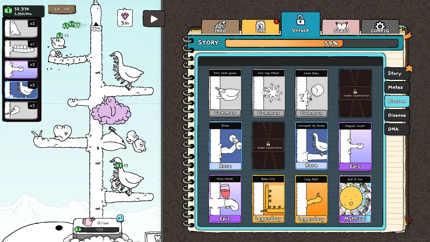 Игровой процесс сочетает простоту кликера с элементами планирования: ветви взаимодействуют друг с другом, и их правильное расположение решает, насколько быстро вы достигнете неба. Позже появляются гемы для покупки улучшений у «доктора», кальций для перманентных бонусов и возможность собирать урожай даже вне игры. Но главный крючок – не механика, а визуал: анимации вручную нарисованы, нарочито просты и одновременно пугающе странны – гуси, рвущиеся из тел, паразитирующие на людях, превращающиеся в деревья. Это не кровь и не кишки, но от зрелищ поднимается лёгкая тошнота – и не отвращение, а от того, что мозг никак не может сложить это в логичную картину.