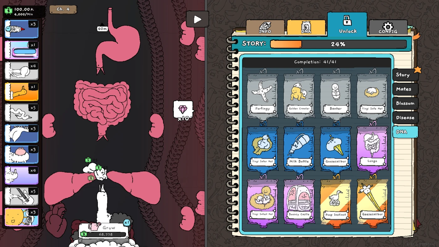 Tingus Goose – не просто кликер, а психоделический кошмар в обёртке любовной истории между гусями. Вы растите странное гусиное древо, вылезающее из живых существ, поливая его водой за счёт монеток, которые приносят крошечные «Тинги» – младенцы, вылетающие из клюва. Чем выше вытягивается шея гуся, тем ближе он к своей небесной половинке. А пока он растёт, из его шеи прорастают ветви – жутковатые, но прибыльные: они перенаправляют, подбрасывают или «перерабатывают» Тинги, создавая причудливые цепочки дохода.