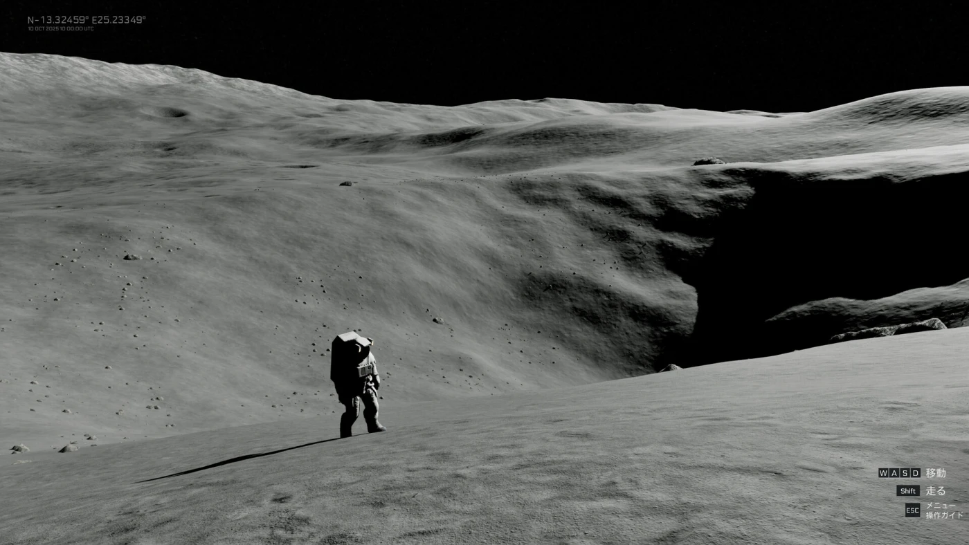 REAL MOON – медитативное путешествие по поверхности Луны, воссозданной с научной точностью на основе данных JAXA. Вы гуляете по ландшафту, сформированному из реальных DEM-карт, статистического распределения кратеров и естественного расположения камней, наблюдая за движением Земли и Солнца в реальном времени.