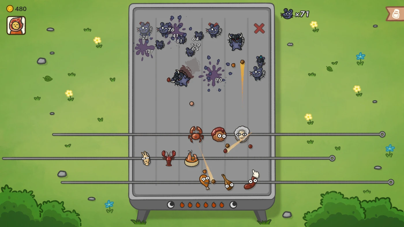 Всё происходит в реальном времени: вы двигаете шампуры по горизонтали, чтобы перекрывать разные полосы, как в фусбале. Композиция команды решает всё – можно поставить защиту спереди, усилить урон сзади или собрать сборную скиллов, которые работают только вместе. Каждый запуск уникален: 20+ Гриллмастеров дают разные стартовые бонусы, а более сотни приправ и предметов рождают безумные комбинации. Хотите, чтобы ваши помидоры взрывались при попадании? Легко. А если ещё полить их чили-соусом – будет пламя.