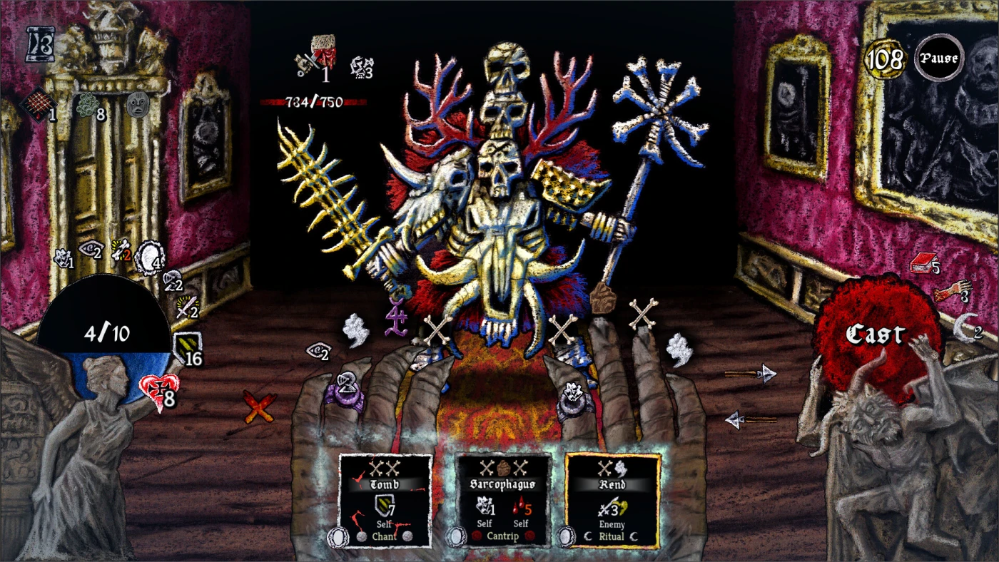 Бои здесь — это головоломки из стихий, жестов и тактических решений. Каждое заклинание создаётся комбинацией узоров на пальцах, активируемых при наличии нужной карты в руке. Как провести линию — решаете вы. Сложные цепочки, перекрёстные срабатывания, неожиданные синергии — всё зависит от того, как вы соедините огонь, лёд, кровь и тьму. Это не «выбросить самую мощную карту» — это импровизация, где каждый ход может стать прорывом.