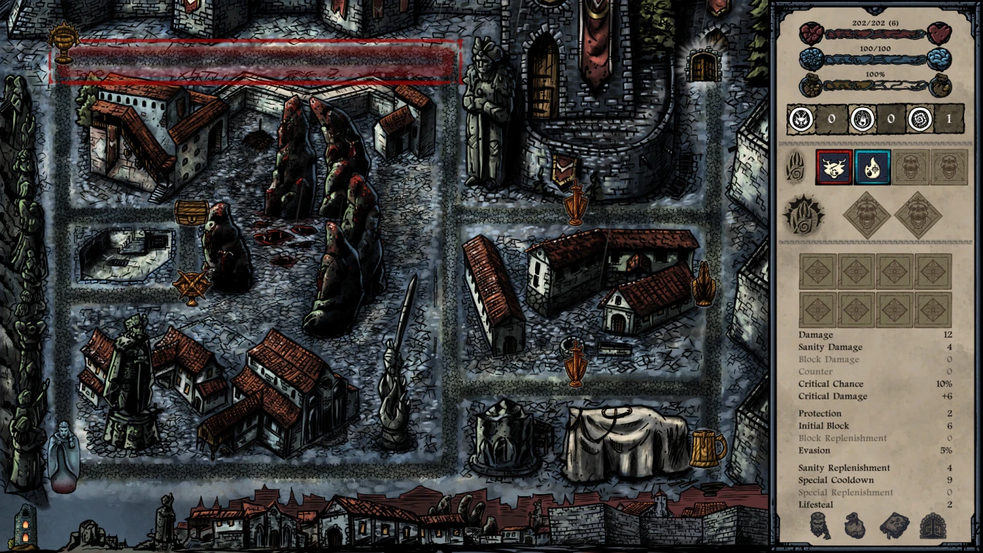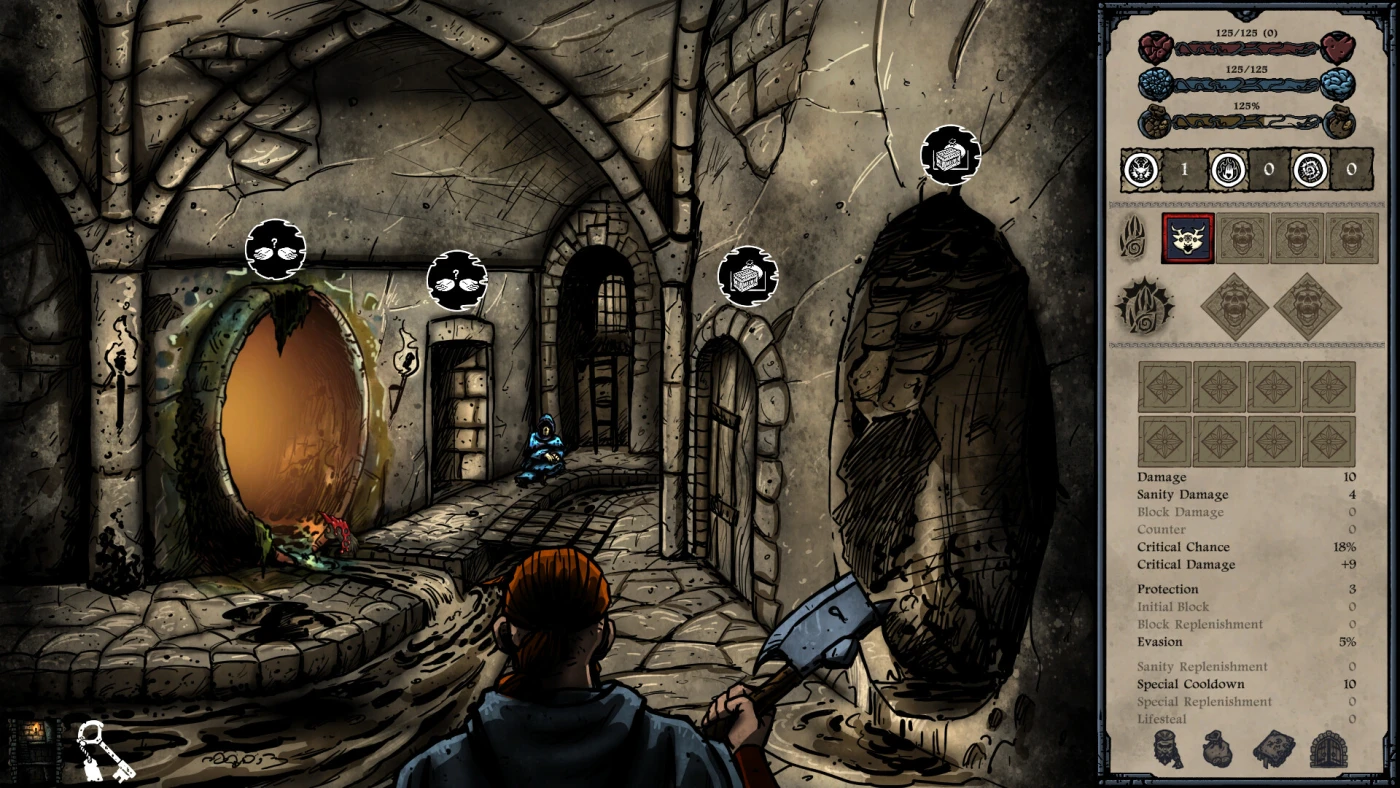 Город разделён на районы — от криминального Старого города до высокомерного Верхнего, и каждый требует особой тактики. Вы исследуете локации пошагово, как в старых книжках-играх: выбираете путь, сталкиваетесь с событиями, ловушками, боями. Бои — пошаговые, с акцентом на выносливость и безумие: здоровье и рассудок равны, а божественные способности питаются именно им. Используйте дары Гнева, Желания или Безумия — но помните: цена всегда есть. Поражение не просто выбивает из схватки — оно ослабляет ваше влияние в городе навсегда.