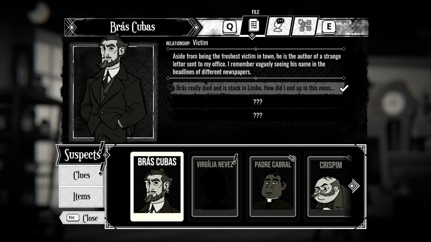 The Posthumous Investigation — это детектив в чёрно-белом стиле старого нуара, действие происходит в Рио-де-Жанейро 1937 года. Вы — частный сыщик, которому приходит странное письмо. Его отправитель — уже мёртвый бразильский аристократ Браз Кубас. Он просит вас найти своего убийцу. И вот вы начинаете расследование, хотя клиент давно в могиле.