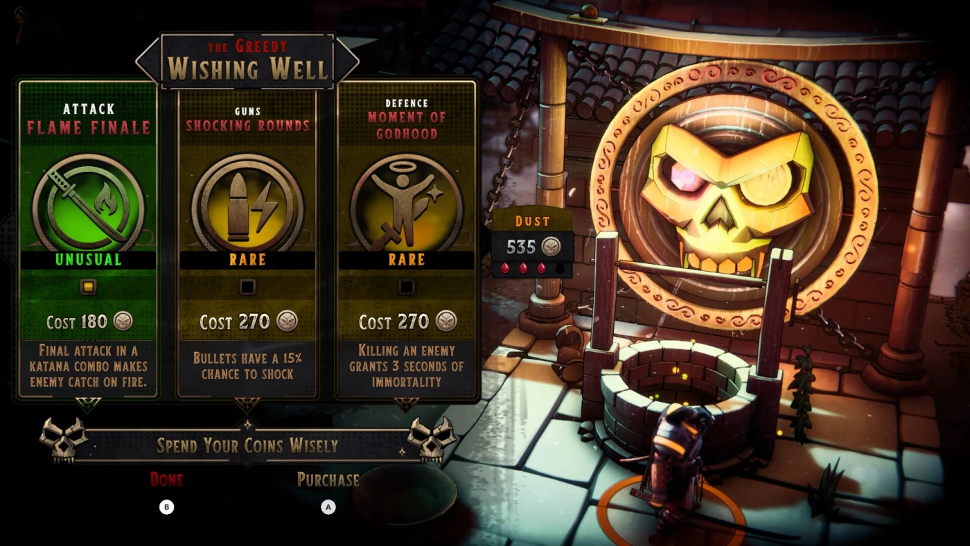 Игра постоянно подкидывает выборы. На алтарях можно взять полезный бафф, но вместе с ним почти всегда приходит случайное проклятие — например, сниженный урон или неожиданный отскок снарядов. Это заставляет каждый забег ощущаться по-новому. Есть чекпоинты, где можно снять проклятие, но за это придётся заплатить половиной здоровья. Добавьте кооператив до четырёх игроков — и хаос в бою становится ещё веселее, особенно когда все вместе рубятся локально.