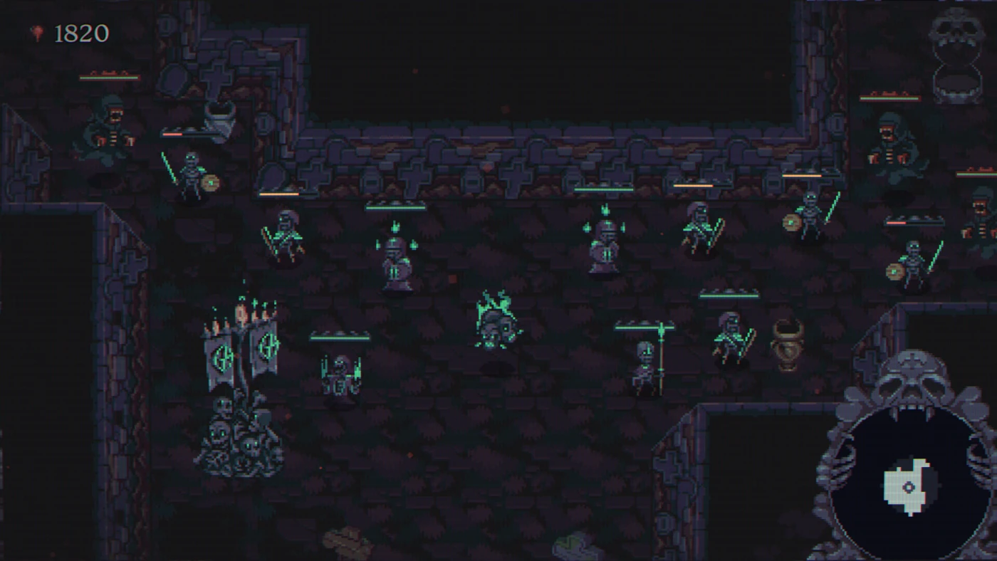 Skull Horde — это простой, но затягивающий рогалик, где вы играете за говорящий череп, которому отрубили голову собственное тело. Теперь вы хотите отомстить и собираете вокруг себя армию скелетов, чтобы прорваться через подземелья. Управление максимально простое — стрелки и пара кнопок, мышь почти не нужна. Вы просто двигаетесь по случайно сгенерированным уровням, а за вами следует растущая орда мертвецов, которая сама сражается с врагами.