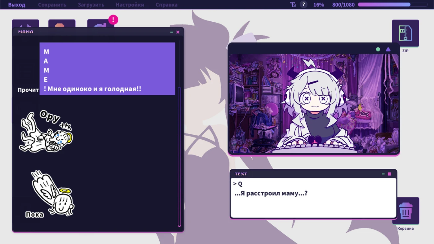Геймплей построен вокруг четырёхполосного ритм-гейма с более чем тридцатью треками — от оригинальных до лицензированных из Touhou и Needy Streamer Overload. Вы отстукиваете ноты, а после каждой песни выбираете карточки с «докидоки», «юнюн» и «хайпом», крутите рулетку и получаете готовый шизопост Qtie. Эти посты — чистый абсурд про Deep State, цифровые деньги и солнце как инструмент контроля. Между песнями открываются дневники, записки и сцены из жизни Qtie, где сквозь весь этот хаос проглядывает настоящая история про одиночество и то, как человек пытается сбежать от реальности. Получается очень атмосферно и цепляюще, если вы готовы нырнуть в этот безумный поток. У нас вы можете скачать Yunyun Syndrome!? Rhythm Psychosis торрент последнюю версию бесплатно на компьютер.