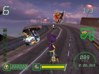 Игровой процесс в целом достаточно прост и основывается на типичных для жанра механиках. Выбираете персонажа, отправляйтесь на гоночный трек, и стартуете с соперниками. Все просто, но есть и несколько интересных факторов. Первый и самый главный заключается в том, что гонять в этой игре можно за разных персонажей. В вашем распоряжении будет почти с десяток персонажей. уникальных, показанных в свое время даже в одноименном клипе. Причем, каждый персонаж уникален не только в плане внешности, но также и в транспортном средстве, и в характеристиках. А второй фактор заключается в наличии гоночных бонусов, которые вы сможете собирать прямо по ходу гонок. На каждом треке имеются пиктограммы с бонусами, которые дают ту или иную способность. Это может быть ловушка для соперника, ускоритель, усиленный движок или еще что-нибудь в этом роде. Всего около двух десятков возможных бонусов.